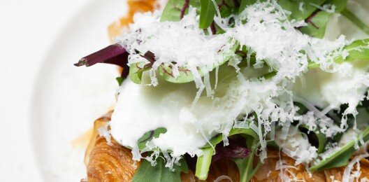 Хрустящий классический круассан собственного производства с воздушным кремом лабне, слабосоленным лососем и яйцом пашот, посыпанный сыром пармезан