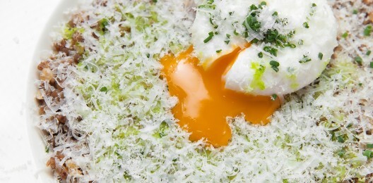 Классический французский омлет, подается с сыром страчателла. Приправлен пряными томатами конкассе и посыпан луком сибулет