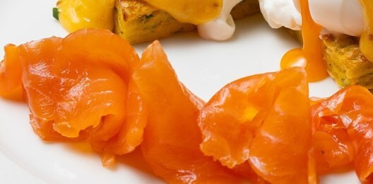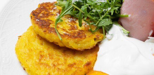 Кабачковые оладьи с лососем, яйцами в смятку и соусом голландез