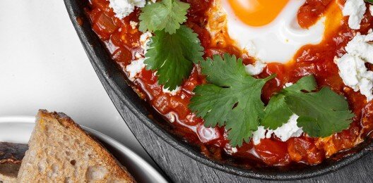 Шакшука с сыром сиртаки, кинзой и зеленым маслом