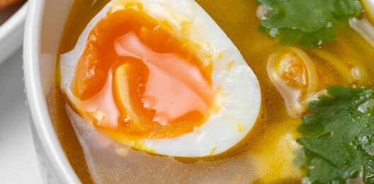 Куриный суп с лапшой, яйцом и гренками из бриоши
