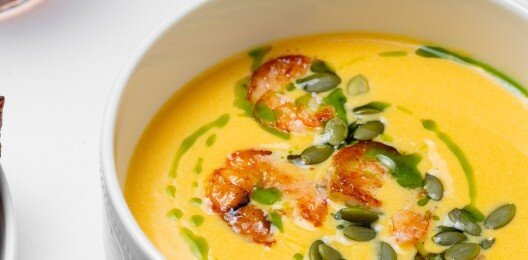Тыквенный суп с креветками, семечками и гренками из бриоши