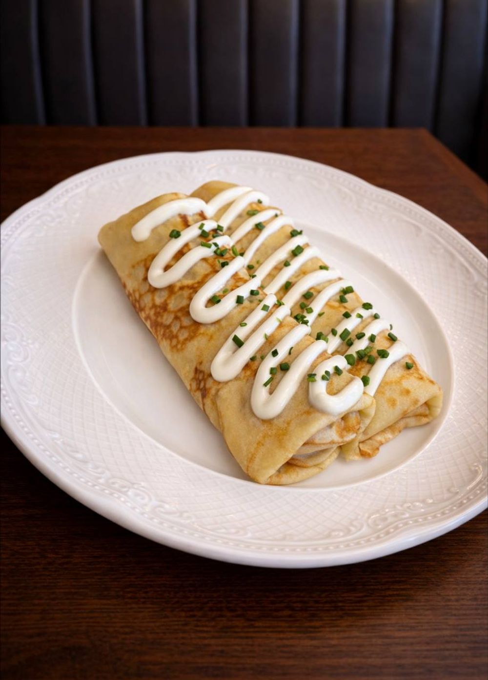 Блины с нежнейшими томлеными говяжьими щечками с луком, морковью и сметаной, сверху украшены луком-резанец.