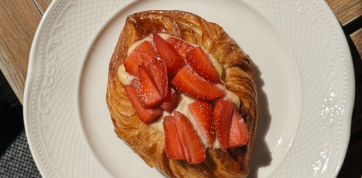 Воздушное слоеное тесто на сливочном масле сочетает в себе ароматные ноты фисташкового крема — нежного сочетания заварного крема и фисташковой пасты. Внутри малиновый джем добавляет легкую кислинку, создавая гармоничный баланс сладости и свежести.