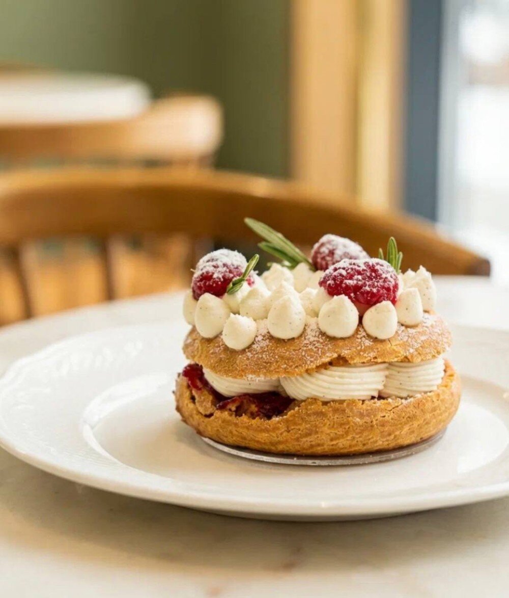 Десерт из заварного теста, с малиновым конфи, нежнейшим взбитым ванильным ганашем на белом шоколаде и свежей малиной.